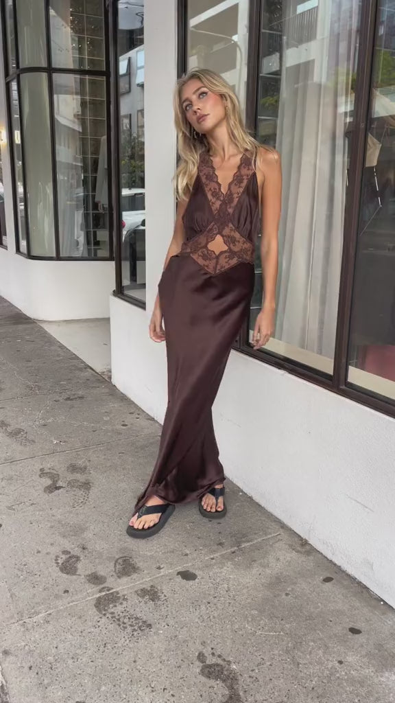 A Chocolate cut out maxi dress featuring contrast floral lace cut-out detail through front to accentuate the waist. Bias cut silk satin softly skims the body.